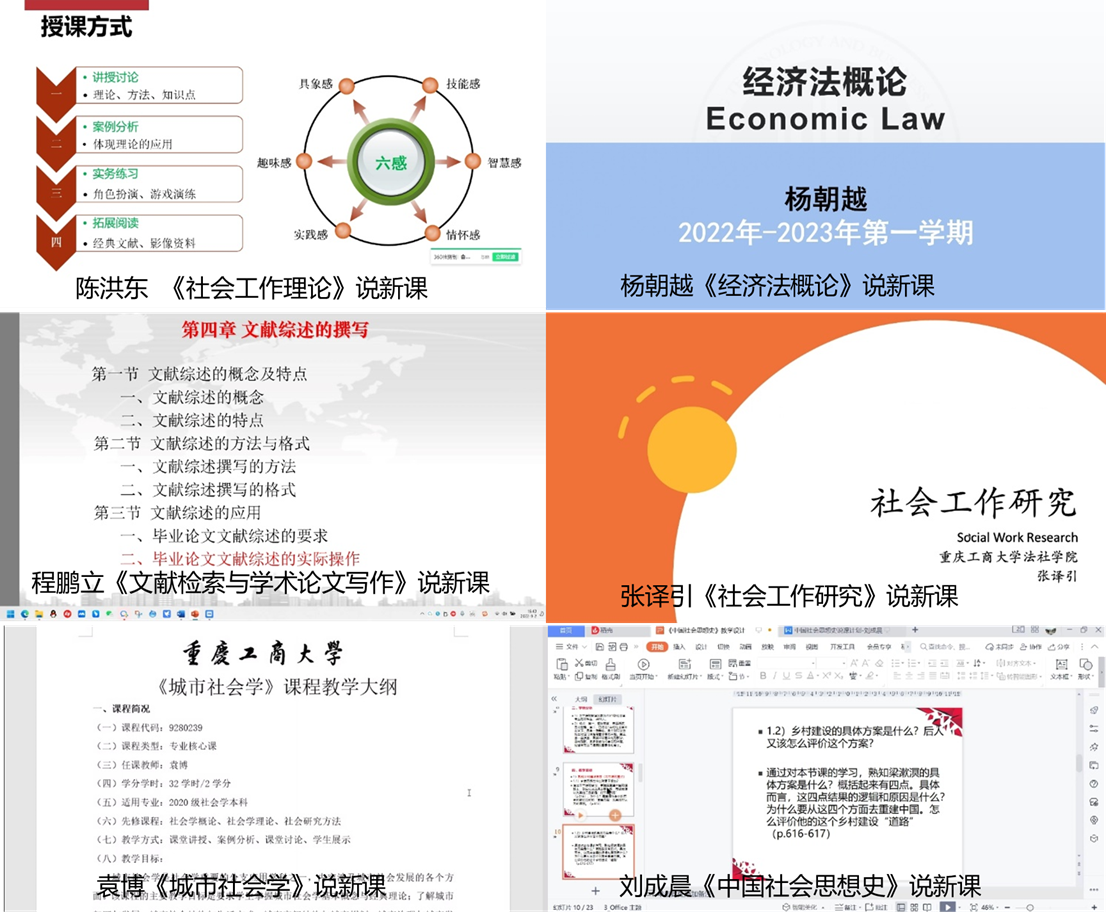 接着,副院长侯明喜从说课活动目的、意义、安排、组织等作了简要说明。讲新课的6位教师们就《经济法概论》《中国社会思想史》《社会工作研究》《文献检索与学术论文写作》等课程,从教材、课程定位、教学内容安排、教学设计、实习实践、考试安排等方面阐述课程整体设计思路,随后对本学期新开课的内容试讲并展示本学期教学资料的准备情况。活动中,教师们语言简练、层次分明、重点突出,从说课材料的编写到PPT的制作,从时间的把握到教学内容的讲授,都在活动前进行了充分地准备,力求做到精益求精。