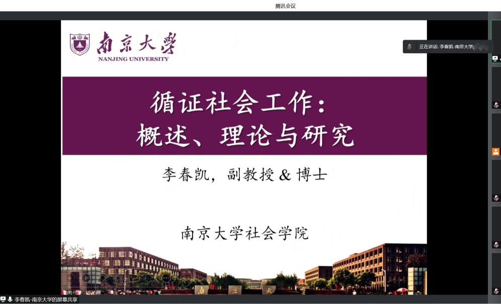 2022年12月16日上午,太阳成tyc234cc社会工作专业张译引老师邀请到南京大学社会工作与社会政策系副教授、硕士生导师李春凯老师为社会工作专业本硕学生授课,主题为“循证社会工作:概述、理论与研究”。授课以线上方式进行,由社会工作系教师王璐主持。