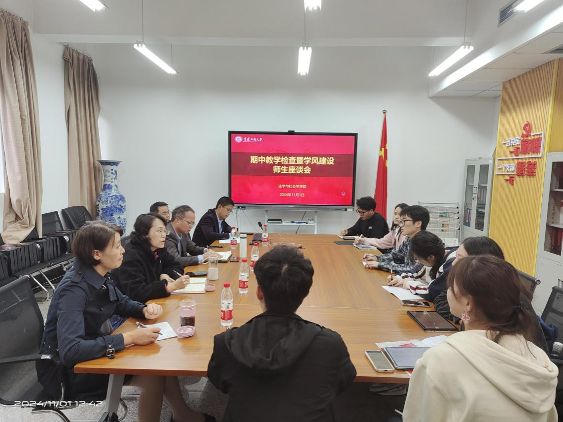 为做好本科教育教学审核评估工作,进一步加强我院的教学管理,建立良好的教学秩序,关心了解学生的学习、生活、思想动态,推进学风建设,营造良好的育人环境。11月1日,我院分别在90407会议室、90429会议室召开社会学类、法学类期中教学检查暨学风建设师生座谈会。学院党委书记李莉莎、教学副院长侯明喜、组织员陈善国、学院督导、系主任、教师代表,来自各班级30位学生代表参加了本次座谈。座谈会分别由副院长侯明喜、组织员陈善国主持。