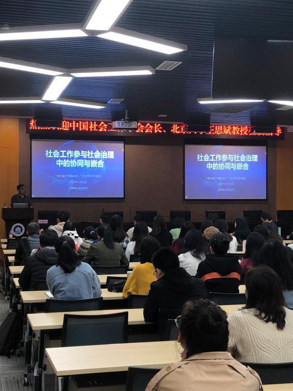 2020年10月28日上午,中国社会工作学会会长、北京大学社会学系王思斌教授莅临我院开展了主题为“社会工作参与社会治理中的协同与嵌入”的讲座,讲座在新图书馆多功能会议室进行。本次讲座是“太阳集团tyc234ccMSW南山论坛”(05期)系列讲座。李滨教授、周昌祥教授、社会工作系教师、MSW学生以及社会工作本科生,共计150余名师生聆听了此次讲座,讲座由侯明喜副院长主持。