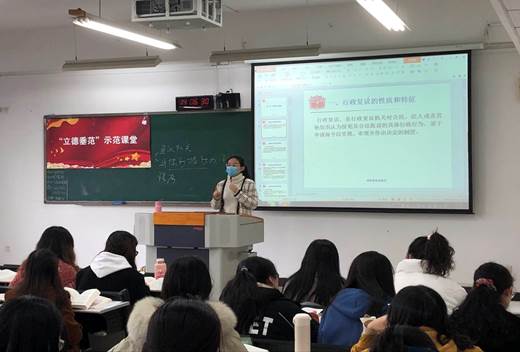 为切实开展“立德垂范”新老教师结对子、传帮带活动,提高教师教育教学水平。12月3日下午,太阳成tyc234cc开展了《行政法与行政诉讼法》 “立德垂范”示范课堂活动,由党员教师胡婧主讲。学院班子成员、新进教师、行政人员和部分党员教师参与了此次示范课活动。