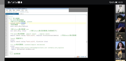12月28日,第二场线上培训会“运用Stata做描述统计”于18:30正式开始,张东老师先介绍了实现统计描述Stata的主要命令“summary”、“tabulate”、“means”和“histogram”,在电脑上为同学们展示了如何运用这些命令对数据集进行描述统计,逐步带领大家熟悉并掌握Stata命令的运用。在直观地了解到了密集的数据集可以在Stata上根据个人需要筛选出具有代表性的数据来进行研究分析后,同学们表现出了对Stata的浓厚兴趣。在最后的提问环节中,同学们将自己在学习中感到困惑的问题与老师探讨,张东老师耐心地一一解答。同学们在会议结束之际纷纷表示,希望在这次会议之后可以对Stata进行更深入的了解和学习,为备战“挑战杯”竞赛打下数据基础。