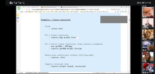 随着“挑战杯”竞赛数据分析方法培训的顺利开展,同学们对于Stata的应用与理解已渐入佳境。张东博士于2021年1月3日7:30在腾讯会议进行第三次线上方法培训。在此次培训中,张东老师对于线性回归进行生动讲解,运用“归去来兮”等例子解释线性回归的字面意思,随后又利用性别、身高等具体案例演示线性回归的多种形式。在此期间,老师强调出相关分析与回归分析的区别,凸显回归分析的在实际运用中的重要性,随后以一元线性回归分析为主,讲解其模型、参数意义以及样本估计等细节,加深同学们对于一元线性回归的理解,为后期对多元线性回归的学习与思考做好铺垫。在会议尾声的解答环节,同学们纷纷提出各自对于线性回归的有关疑惑,张东老师对此进行耐心解答。