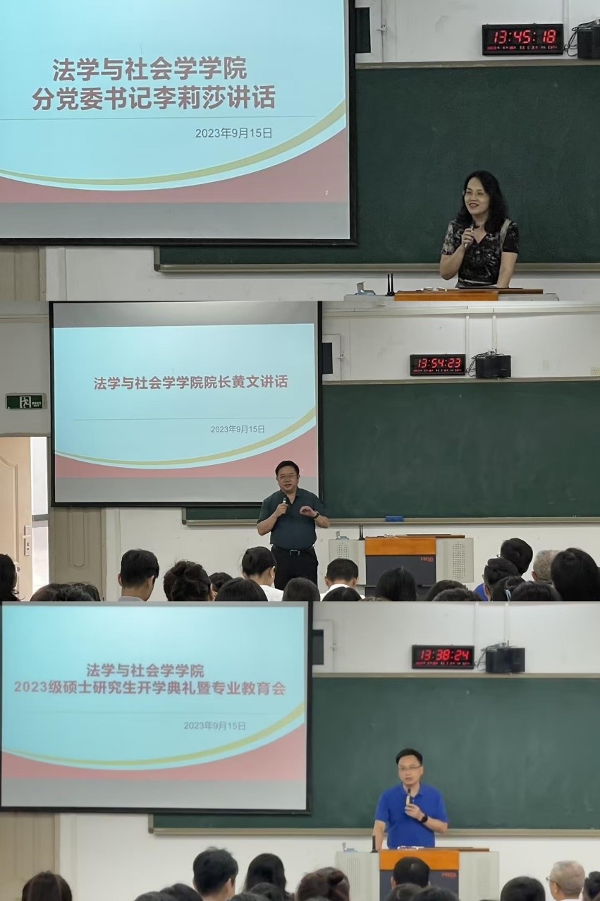 党委书记李莉莎代表全院师生对新生们的到来表示热烈欢迎。李书记就同学们如何实现自己的人身价值提出了四点建议:一是厚植家国情怀,秉持专业精神,投身复兴伟业;二是修身修心,做一个自立进取且和谐的人;三是希望同学们革新学习方法,掌握新的学习路径,注重科学的学习和学习方法,主动学习、主动研究、勤学善思,不断突破自己,提升自己的学术素养和研究能力;四是保持奋斗之姿,注重培养创新精神和实践能力。李书记希望同学们能坚守信仰,积蓄力量,做好职业规划,走好自己的青春之路,奋力书写法社研究生的青春华彩。