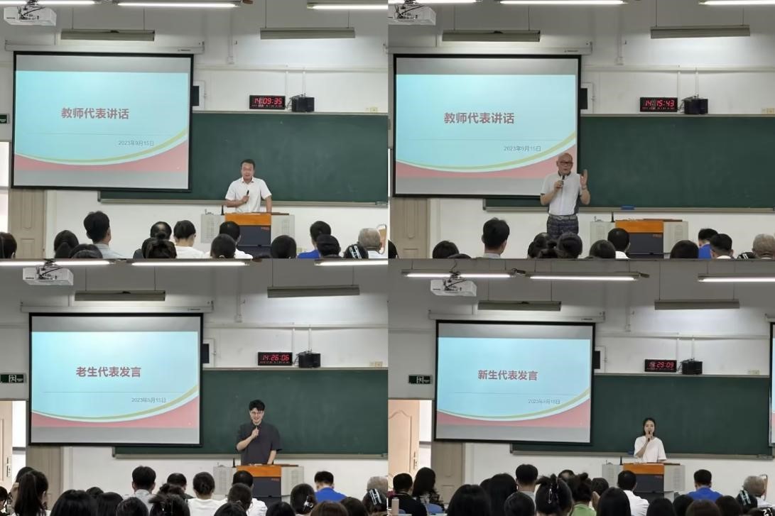 老生代表汪杨向同学们传授经验,鼓励大家培养自己的兴趣爱好,提升自己的综合能力,保持对知识和生活的热情,并勇敢的去追求自己的梦想;新生代表吴梦洁满怀激情地表达了跨入新校园的感受,立志要锐意进取,开拓创新,和同学们携手共进,迎接美好的未来。