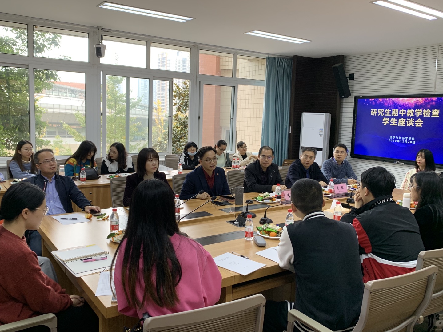会上,刘勇副院长向与会同学介绍了研究生院以及学院参会的领导和老师,并向到场的同学和领导介绍了本次会谈主题,主要听取各专业研究生对教学及任课教师及学校各方面的建议及意见。接着,研究生院领导田双全院长询问社会学和社会工作专业学生进入法学院是否适应,期望同学们能够畅所欲言,将教学、生活、学习和职业生涯等问题与在场的领导和老师反应,研究生院及法社学院可以解决将及时解决,不能解决将问题会反馈给有关职能部门,请相关职能部门解决。然后19、20级学生代表分别就实际生活中所遇到的学习和生活问题向学院提出了意见,田院长、曾院长以及刘院长解答了同学们所面临的疑虑,并表示一些问题在接下来的日子里会进行调整。会议最后,刘院长对此次会议进行了总结,并对学生提出了期许。