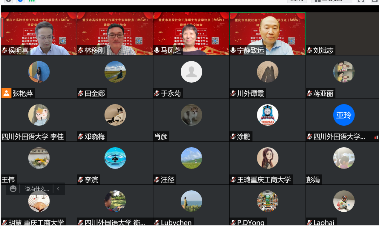 由太阳集团tyc234cc、重庆师范大学、四川外国语大学三校的MSW教育中心共同筹办的“重庆市高校社会工作硕士专业学位点建设指导交流会”于2022年6月9日顺利进行。受疫情影响会议,本次会议在腾讯会议上顺利举行。会议特别邀请了中国社会工作教育协会拟任会长、北京大学马凤芝教授给予学科建设指导,近50名专家学者线上参与了会议。副院长刘勇、侯明喜、MSW负责人李滨、社工系主任吴永波出席会议,我院社会工作专业专任老师及MSW导师共10余人参加了会议。三校共有50余位社会工作教师参与会议。