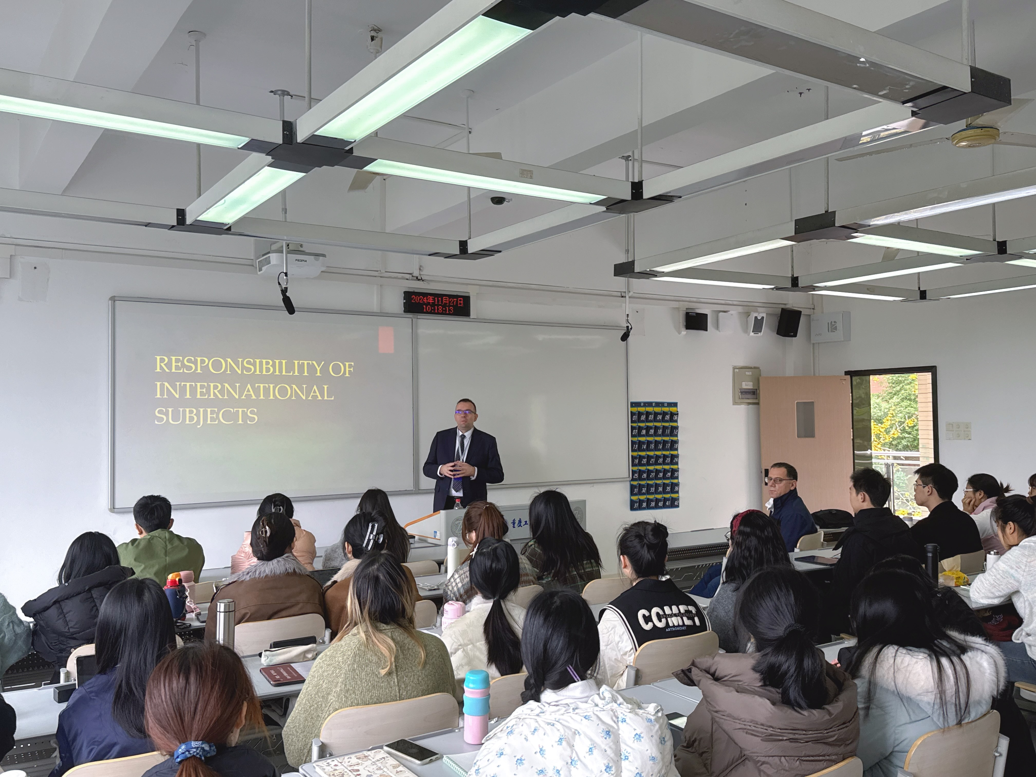 Bojan Tubić教授为现场师生做题为“Responsibility of International Subjects”的学术讲座。他围绕国际法中的国家主体、国际组织和个人主体之间的责任启动、责任分配和因果关系进行分析,同时结合国际法近百年来的诸多案例和争议问题深入浅出的进行了讲解,引人深思。在提问互动环节,老师和同学们围绕国际法教学、学习、环境保护中的全球责任以及塞尔维亚的双多边国际协议情况等问题开展讨论。与会师生均表示受益匪浅。
