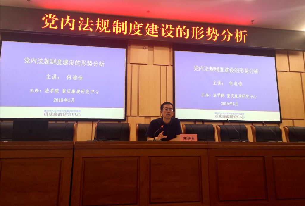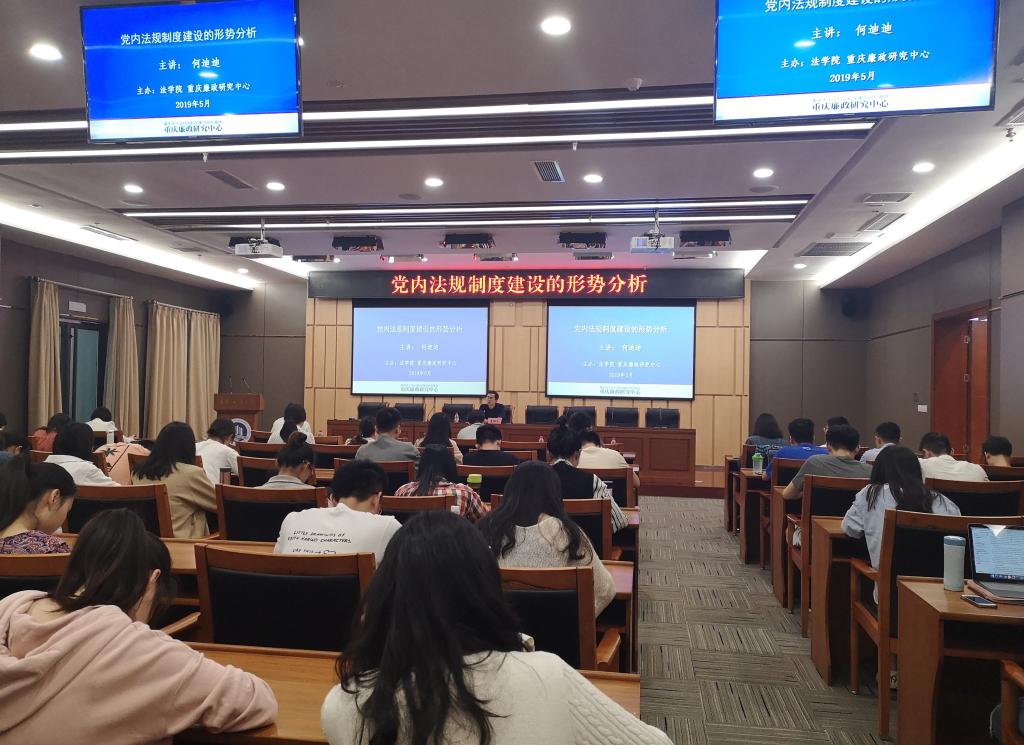 5月24日下午,《党内法规制度建设的形势分析》学术讲座在校新图书馆第一会议室举办。本次讲座由法学院和重庆廉政研究中心主办,邀请重庆市党内法规研究中心何迪迪研究员主讲。参加讲座的有法学院和重庆廉政研究中心的领导和研究员,法学院法律硕士研究生和部分本科生。