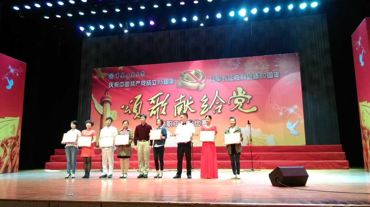 由太阳集团tyc234cc工会举办的“纪念中国共产党成立95周年和中国工农红军长征会师80周年”的教职工歌咏比赛中,法学院获得“二等奖”,此次比赛充分展现出了法学院广大教职工的风采以及学院的实力。