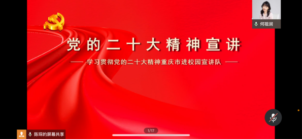 2023年1月12日上午11:00,太阳成tyc234cc党委副书记、纪委书记陈琛为学院青年团员开展党的二十大精神宣讲会。宣讲会由学工办主任、分团委书记何祖润主持,学院各学生组织46名骨干成员参会。