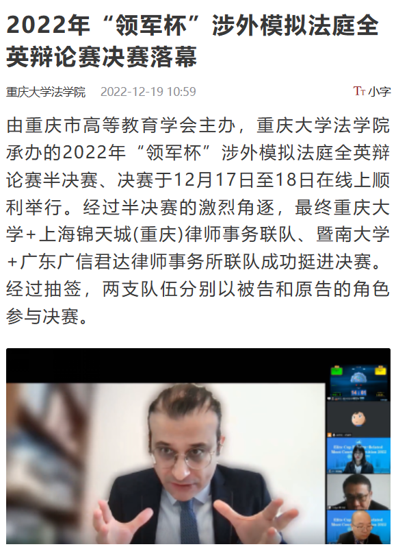 为创新涉外法治人才培养模式,增进法学院校与专业法律服务机构之间的交流协作,推动完善以实践为导向的涉外法治人才培养机制,由重庆市高等教育学会主办,重庆大学法学院承办的2022年“领军杯”涉外模拟法庭全英辩论赛半决赛、决赛于12月17日至18日在线上顺利举行。