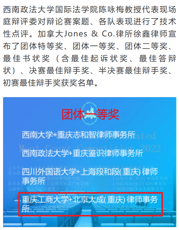 我院参赛队伍由法学系教师向往博士带队指导,选拔20级法学专业本科生周思延、21级法学专业本科生徐百合、22级法律专业研究生蒋利平、21级法律专业研究生黄玉梅4名同学组队,与北京大成(重庆)律师事务所律师共同参赛。经书状提交、初赛、半决赛、决赛等环节,我院师生最终取得优异成绩,荣获“团体一等奖”。