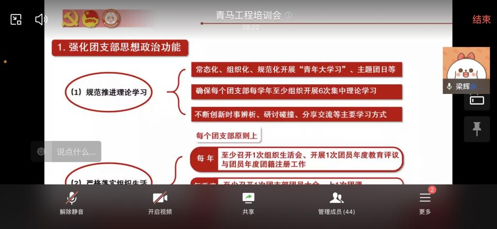 梁辉从学习宣传贯彻党的二十大精神入手,总结归纳了高校团学改革中的痛点和难点。同时,他全面详细的为大家解读了《关于改革创新高校共青团工作 切实增强思想政治引领实效的若干措施》《关于巩固高校学生会(研究生会)改革成果的若干措施》等最新文件,也同大家一起分享了青马工程、一校一品、挑战杯、校园之春等高校共青团工作中的品牌活动。
