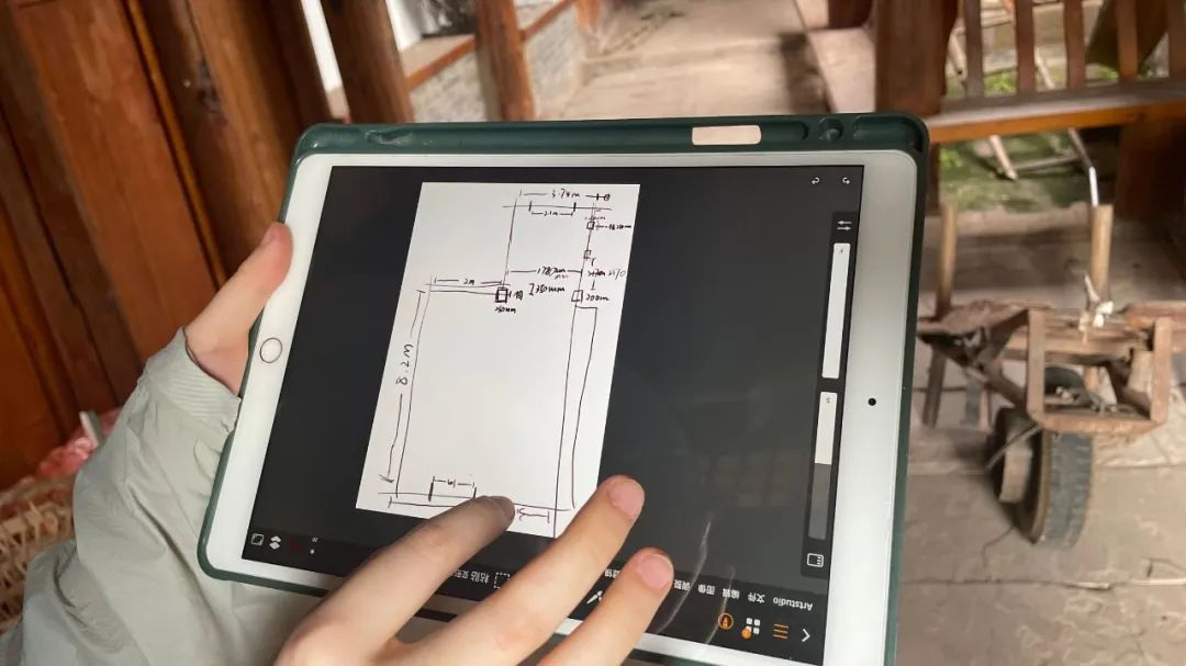 7月15日,调研团成员前往二佛村下涞滩考察陈列馆选址。这个始建于宋朝并入选“中国传统村落”的千年古镇,成员经过多方比较和咨询,最终选择位于下涞滩正街且靠近渠江(涞水)畔的旧宅作为乡情馆的主要设计空间。孟令法的指导下,调研团成员对该空间进行了详细的测量和记录,包括房屋的面积、结构、布局、材料等,并结合涞滩独特的文化底蕴将陈列馆分为四个展区:历史展区、民俗展区、艺术展区和人物展区。最后成员们现场绘制了一份乡情馆的设计草图和测量图。经过讨论,设计团队将陈列馆命名为“涞滩印象”希望通过这个名片传达出涞滩古镇的人文风情历史积淀。与此同时,调研团成员借助入户访问村民的契机,进行展品实物资料的预先普查工作,记录得到20余条展品线索,包括传统农具、老照片老物件、古钱币、老家具等。