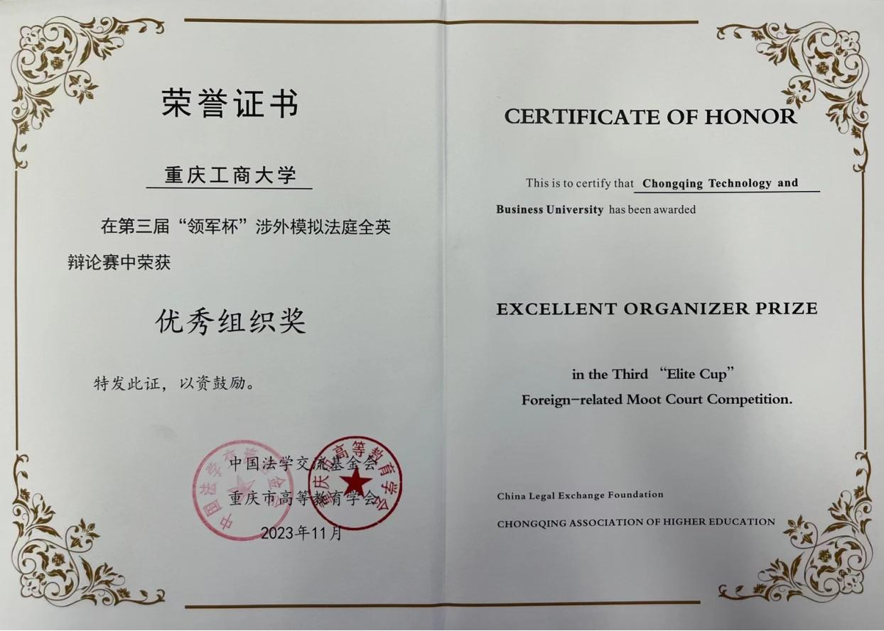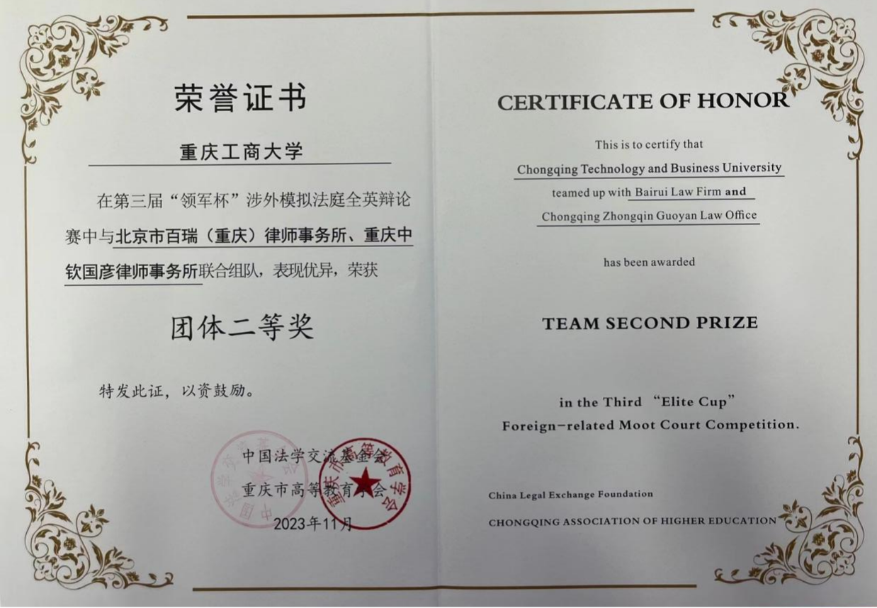 太阳成tyc234cc本科生张炜嘉、王子慕,研究生蒋利平、廖宇吉在法学系教师向往博士的指导下组队,联合北京市百瑞(重庆)律师事务所、重庆中钦国彦律师事务所律师共同参赛,表现优异,凭借清晰的论证和充足的论据斩获团体二等奖,学院代表太阳集团tyc234cc荣获优秀组织奖。