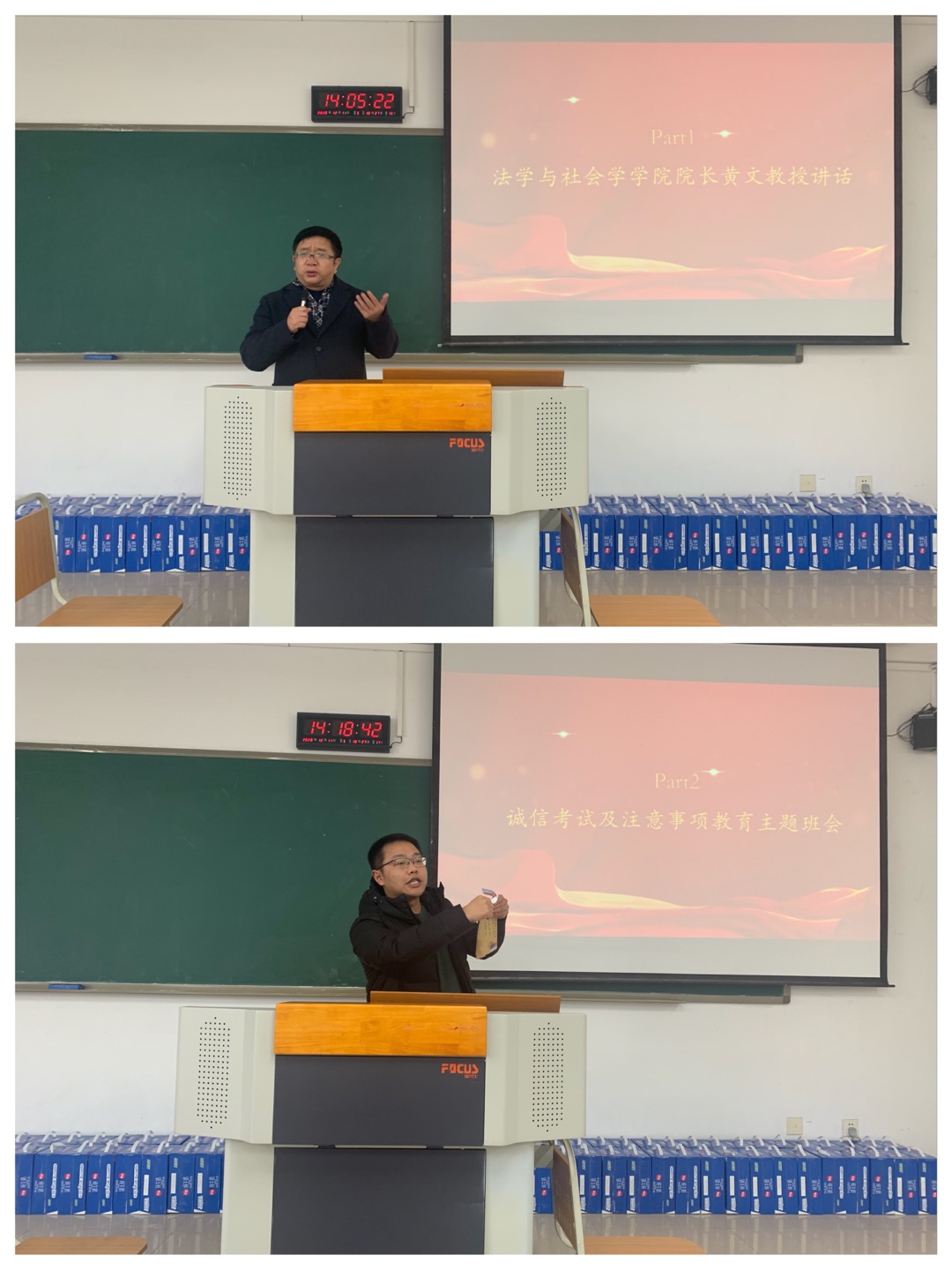 首先,院长黄文教授为参加研究生考试的同学们加油鼓劲,在备考的最后冲刺阶段,肯定和赞扬了2017级学生在国家统一法律职业资格考试中创下学院通过率新高的优异表现,以自身的考研经历、上海政法学院刑事司法学院院长姚建龙教授等杰出校友的求学经历等事例引入,鼓励同学们在考研的路上坚持到底,不做逃兵,通过攻读研究生提升自己的学术水平,扩展自己的眼界和见识。随后,2017级辅导员罗观老师为到场的各位同学召开了研究生考试注意事项和诚信教育主题班会,从研究生考试的纪律规定、答题规范、交卷注意事项等方面为同学们详细讲解了参加研究生考试需要注意的各种问题,也再一次为大家敲响了诚信考试的警钟。
