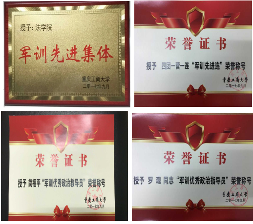 2017年7月18日上午,太阳集团tyc234cc2017级学生军训总结表彰大会在南岸校区南操田径运动场隆重举行。我院荣获2017级学生“军训先进集体” 荣誉称号,同时我院2017级学生“四团一营一连”(该连由17级法学一、二、三班的全体女生组成)还荣获“军训先进连” 荣誉称号。在表彰上,我院副书记简福平博士获“军训优秀政治教导员”荣誉称号;辅导员罗观老师获“军训优秀政治指导员”荣誉称号;颜畅等15位2017级学生获“军训优秀学员”荣誉称号。