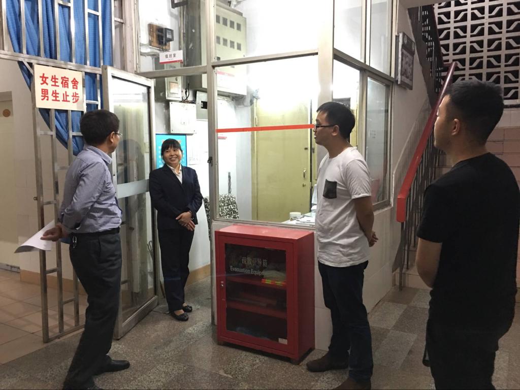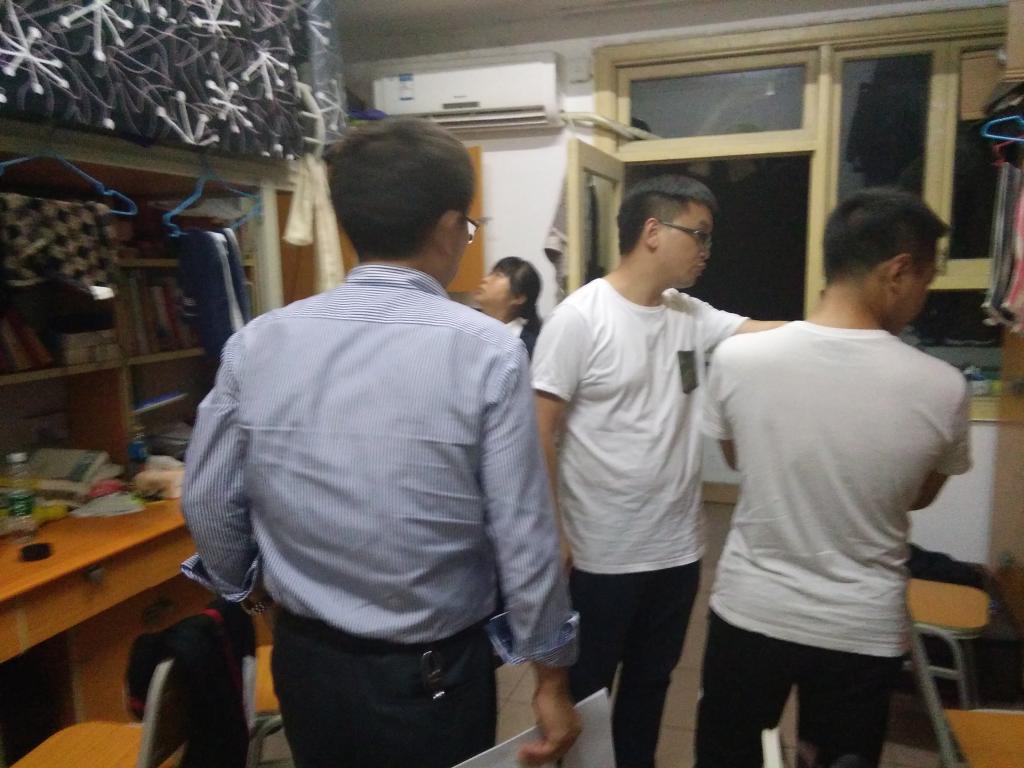为进一步加强学生宿舍安全管理工作,督促学生养成良好的寝室卫生习惯并合理安排寝室活动,2017年9月4日晚,我院分管安全工作的刘勇副院长和分管学生工作的简福平副书记带领辅导员刘鑫、罗观两位老师深入南十栋学生公寓,对学生宿舍的安全、卫生以及学生寝室活动等情况进行了检查。