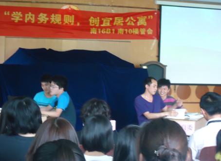 活动首先由黄河老师致辞,并介绍此次活动的背景、目的以及活动基本情况。接着,同学们表演了别开生面的小品《乱“室”家人》,小品让同学们深有感触,踊跃地发表了各自感想,并对如何搞好内务卫生提出建设性意见。接着,优秀寝室的图文展示,使同学们对于优秀的内务卫生有一个直观的认识,优秀寝室成员也随之畅谈对宿舍文化的认识、保持宿舍卫生优秀的窍门、对男生寝室如何保持良好卫生的建议等卫生方面的心得。通过回答小问题的环节,考察了同学们对学生处下发的关于卫生奖励与处罚相关条例的了解程度,同时也借此对同学们进行一次宿舍管理条例的再教育,增强了同学们对寝室卫生的重视。