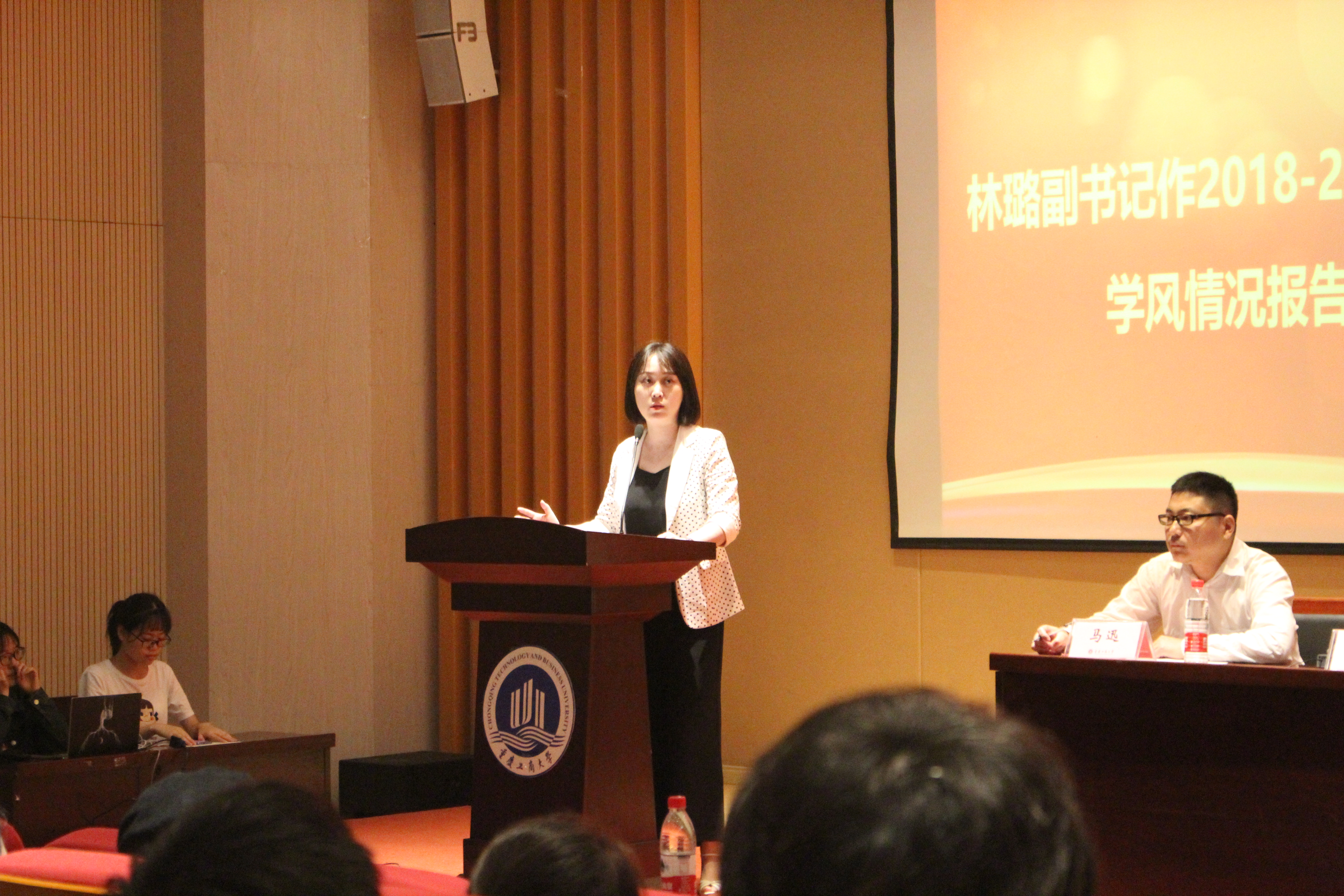 会议正式开始,首先由林璐副书记作2018-2019学年学风情况报告,她指出,学风建设工作是做好一切学生工作的基础,学院坚持从学生实际情况出发,构建“以课堂学习为基础、学科竞赛为动力、第二课堂为载体、考研法考为抓手”的学风建设体系,法学院已形成良好的班风学风,2015级法考通过率创历史新高。学院通过开展模拟法庭、辩论赛、法学专业征文、法律文书等学科竞赛系列活动,学生综合素质和能力进一步提高。法学院辩论队获得第十七届“大帝杯”辩论赛冠军、十六届“新生杯”辩论赛冠军。学生参加全国大学生“挑战杯”竞赛,参赛规模较往年增幅明显。通报了近年来学院的升研情况,希望同学们有计划、分步骤地安排好考研和法考的复习任务,严以律己,克服消极思想,增强学习紧迫感,以“天将降大任于斯人”的时代使命,努力学习,奋力拼搏!
