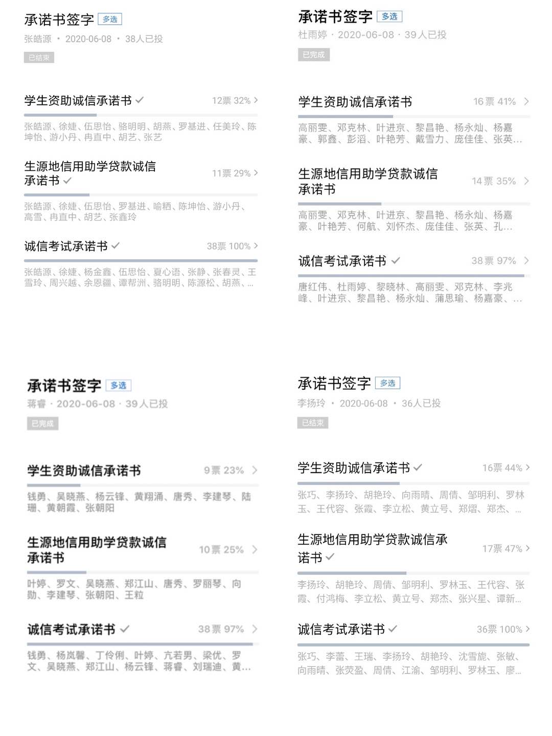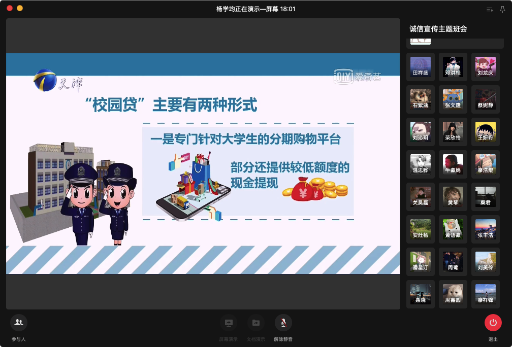 2020年6月1日上午,2018级法学二班通过企业微信开展了以学生资助诚信教育为主题的线上活动。同学们纷纷表示此次活动向大家普及了金融知识,引导大家珍爱信用,理性借贷,不负信任,提高了大家的征信意识、金融知识、风险意识和法律意识。
