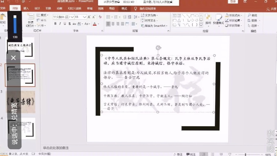 2020年6月5日19:30,2018级法学一班开展了以“美好年华,诚信守法”为主题的诚信宣传主题班会。辅导员刘鑫向同学们详细介绍了诚信的重要性,结合法学专业引导大家诚信守法,同时向大家介绍了校园贷的危害性以及怎样避免掉入陷阱,帮助大家更好地树立了诚信理念和正确的消费观、荣辱观、价值观,提高了同学们的法律意识。