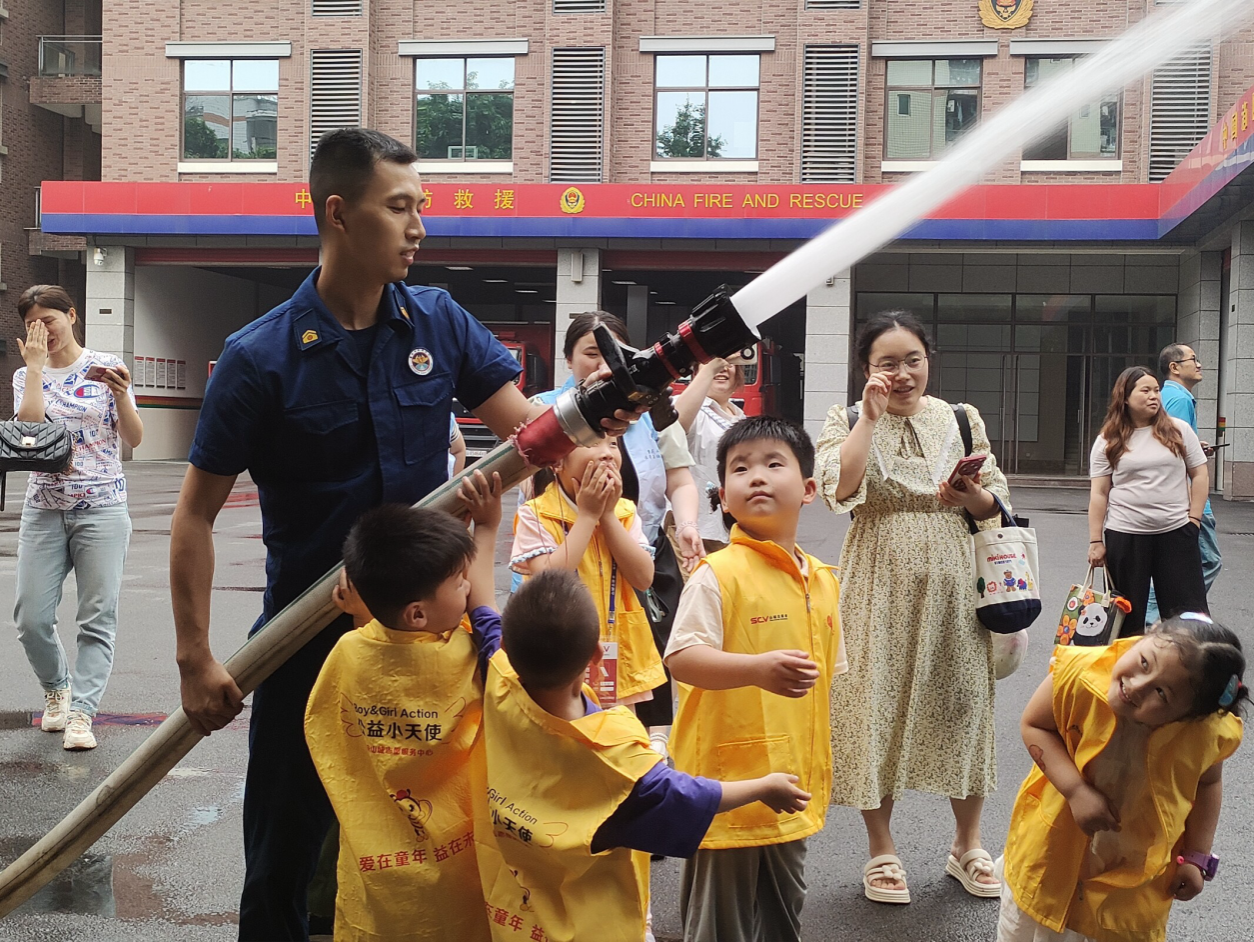 太阳成tyc234cc“益起爱”青年志愿者服务队联合重庆山城志愿服务中心于2024年5月18日在重庆市南岸区二塘消防救援站开展了“蓝焰同行,守护成长”消防站参观活动,邀请报名担任“爱心小天使亲子义工月捐计划”志愿者的16名小朋友共同参观学习消防安全知识。
