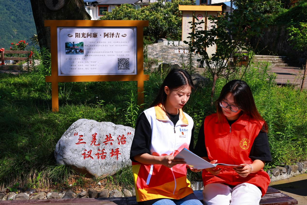 活动中,在法学系专职教师卢博和许偲炜的带领下,服务队首先来到石椅村“三羌共治”议事坪,与村委会副书记陈艳进行了深入交流,认真听取当地“尔姆孜巴”协商平台的运行情况介绍,精准把握了该平台全民议话、民主公约的核心内涵。随后,陈艳副书记详细介绍了石椅村在法治护航下推进灾后重建、发展特色产业的宝贵经验,从通过法律手段化解矛盾纠纷,到依托法治保障产业项目顺利推进,全面展现了法治在乡村振兴中的保障作用。交流结束后,队员们参观村史馆、开展实地调研访谈,贴近村民生活,倾听法律困惑与需求,为后续普法活动的开展奠定基础。