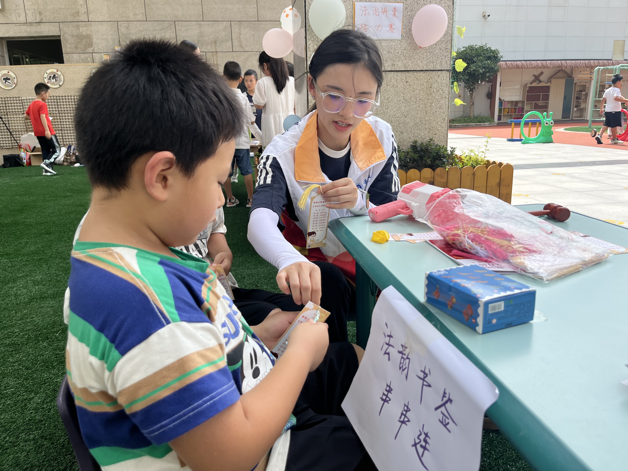 游园会现场设置了多项互动游戏,吸引了孩子们踊跃参与。普法队员们将法律常识巧妙融入轻松的游戏环节,“法条传声筒”让孩子们在对话传递中学习法律知识,“法治沙包接力赛”引导其思考日常中的法律小问题,“法治萝卜蹲”则通过角色扮演加深孩子们对法律体系的了解。队员们耐心讲解规则,俯身互动,让孩子们在玩耍中建立起对法律的初步认知。