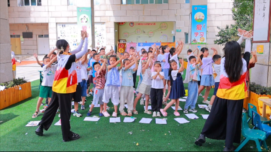 游园结束后,全体小朋友共同学习歌舞《宪法伴我们成长》,普法队员们用易于理解的旋律和简单手势进行教学。孩子们手持小国旗,以清澈响亮的歌声回应对祖国的热爱和宪法的崇敬。