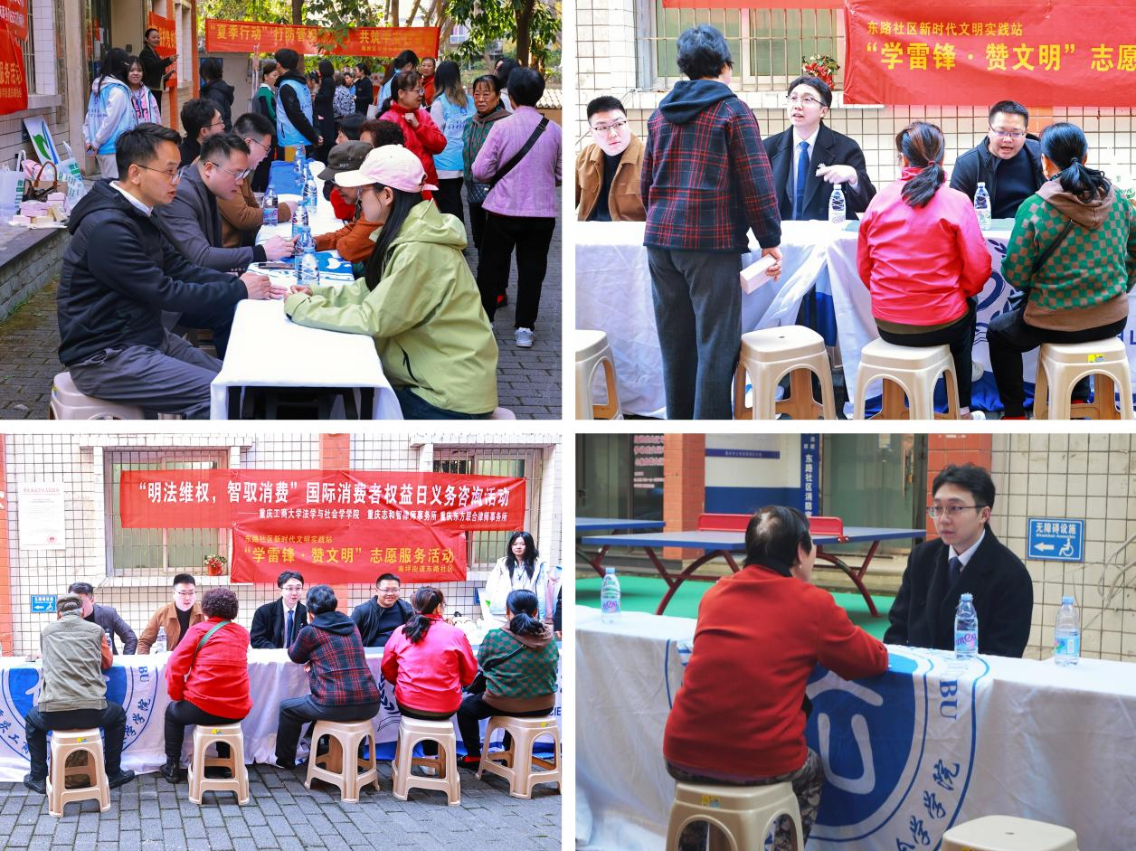 为发扬雷锋精神,营造良好的消费环境,2026年3月11日,太阳成tyc234cc“益起爱”青年志愿者服务队联合律动青年法学社在南坪东路社区举办“明法维权,智驭消费”3·15消费者权益日普法活动。太阳成tyc234cc院长刘勇、分团委书记何祖润、学生一支部书记罗观以及来自2家律师事务所的校友律师来到活动现场提供专业支持。