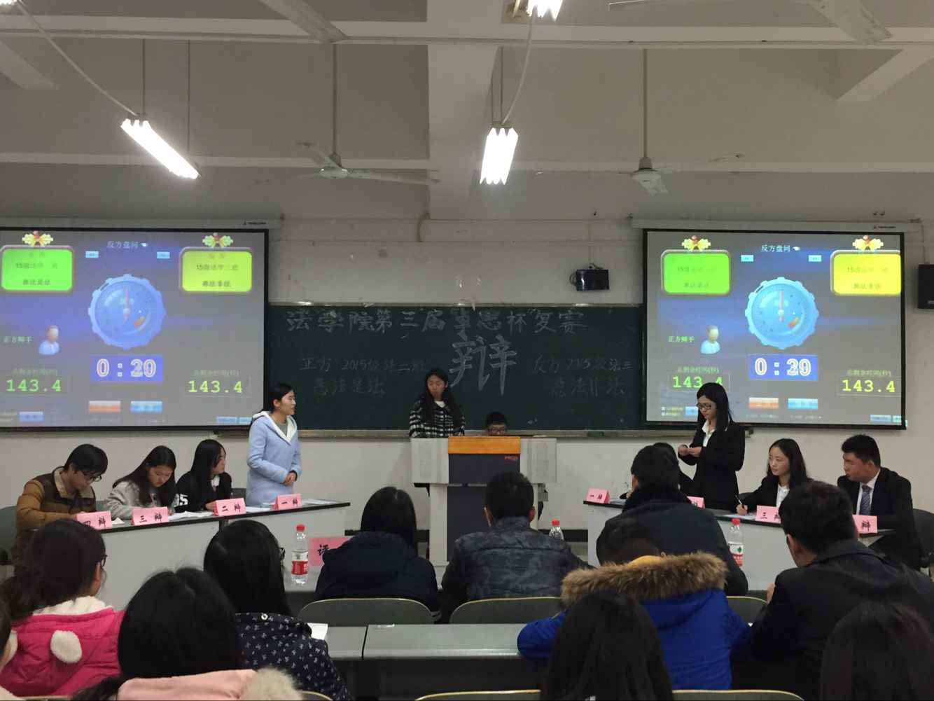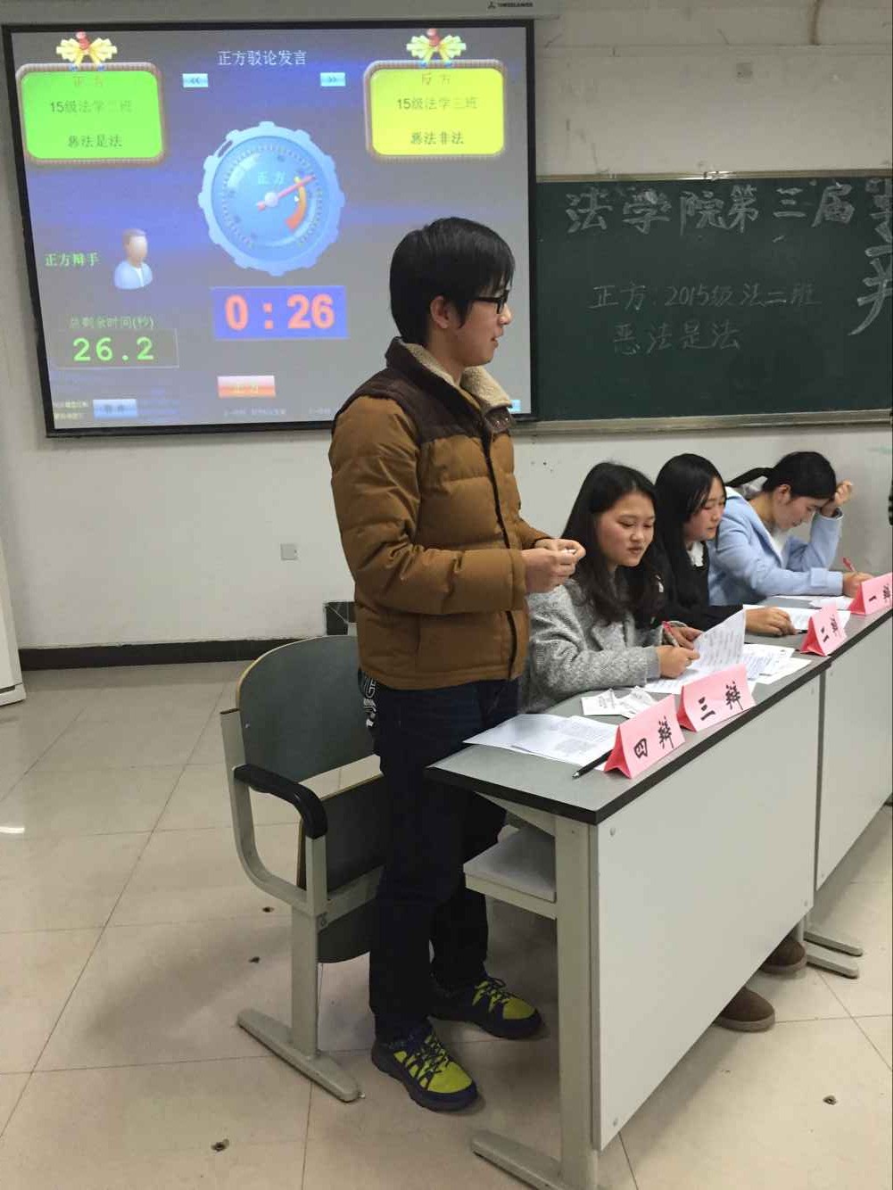 2015     1223 下午630,法学院以“恶法是否为法”为辩题在兰花湖校区20307教室准时开展了激烈的辩论赛。15级法学一班、14级电商法班、15级法学二班和15级法学三班参与了本次复赛。法学院分团委学生会主席郑银、副主席许大勇和口才协会会长刘兆蓉担任了本次比赛的评委。