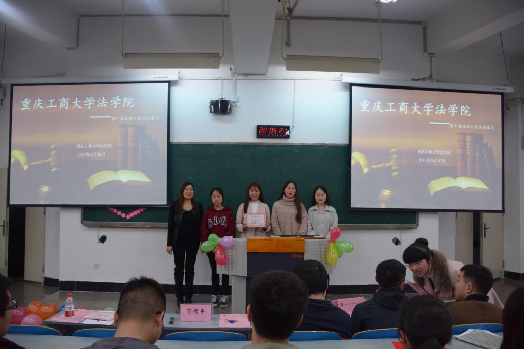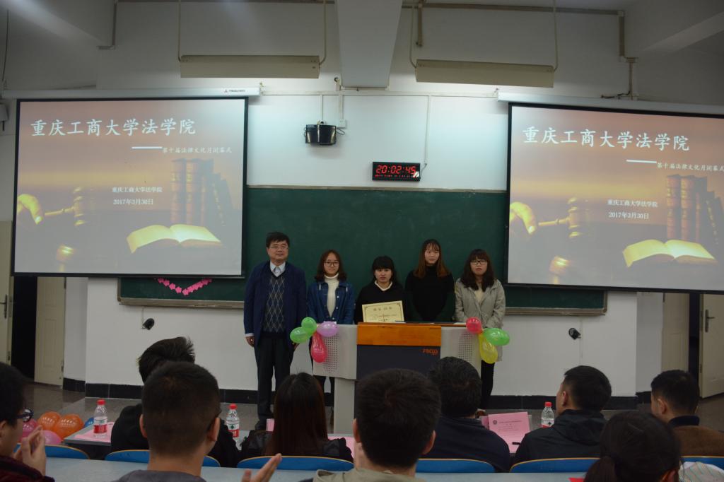 2017年3月30日晚18:00法学院第十届法律文化月颁奖典礼暨闭幕式在南岸校区慧智楼90326教室隆重举行。法学院陈丹妮老师主持了本次颁奖典礼暨闭幕式,法学院党总支书记李自维教授、法学院院长杨和义教授、法学院党总支副书记简福平博士、法学院副院长刘勇教授、校党委宣传部程亚老师以及法学院部分师生代表共计150余人参加了本次活动。