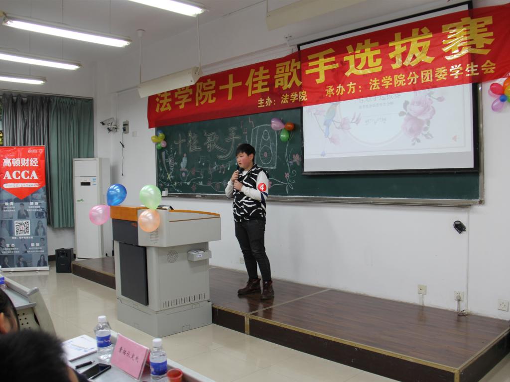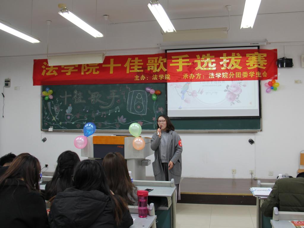 为全面贯彻和落实十九大精神,响应十九大号召,发展素质教育,培养德智体美全面发展的社会主义建设者和接班人,同时也为了选拔学院优秀的歌唱人才,2017年12月1日下午3时,由太阳集团tyc234cc法学院分团委学生会承办的法学院十佳歌手选拔赛在南岸校区慧智楼90325隆重举行。担任此次活动的评委为上届校园十佳歌手张渝和毛雯婷,体艺部部长闫钰涓担任本次活动的主持人。