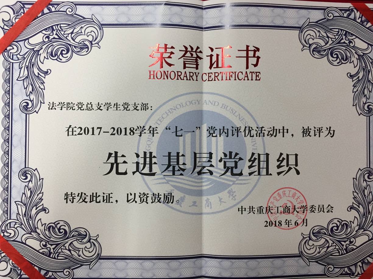 在2017-2018学年,法学院党总支学生党支部一直致力于支部的自身建设与发展,不断在实践中增强党员党性意识、宗旨意识、大局意识,提升爱党、护党情怀,发挥党员先锋模范作用,增强党组织的凝聚力和号召力,在工作中取得了卓越的成绩。在中共太阳集团tyc234cc委员会举办的“七一”党内评优活动中,法学院党总支学生支部喜获“先进基层党组织”荣誉称号。