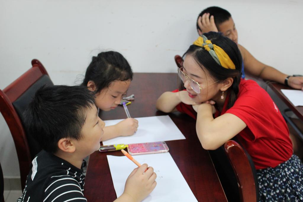 宣讲团成员指导小朋友创作商标图案