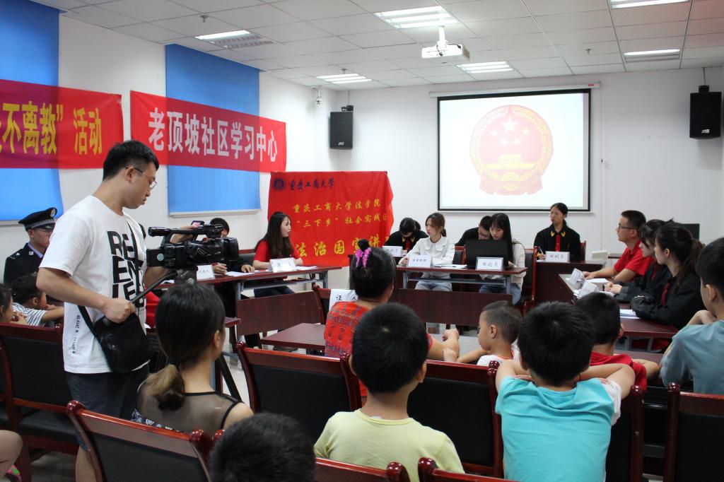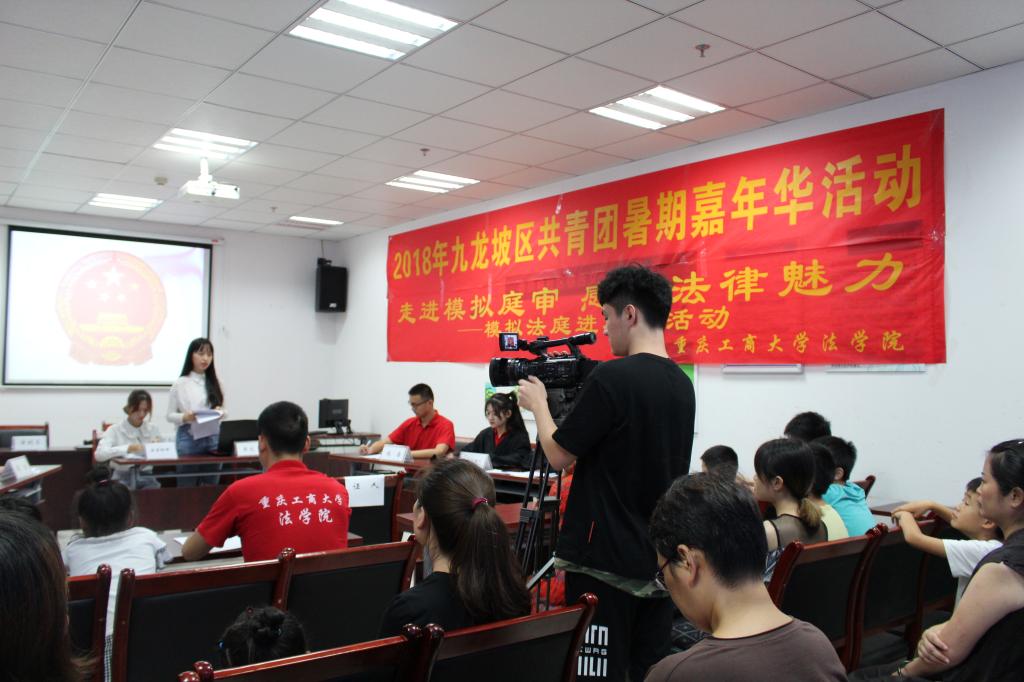 7月27日上午,太阳集团tyc234cc法学院暑期“三下乡”社会实践活动市级重点团队——“依法治国宣讲团”在石桥铺街道老顶坡社区给当地居民带来了一场“走进模拟庭审 感知法律魅力”——模拟法庭进社区活动,三十余名社区居民旁听了此次模拟庭审。《重庆日报》《重庆时报》《重庆青年报》以及重庆电视台等多家媒体对此次活动进行了报道。