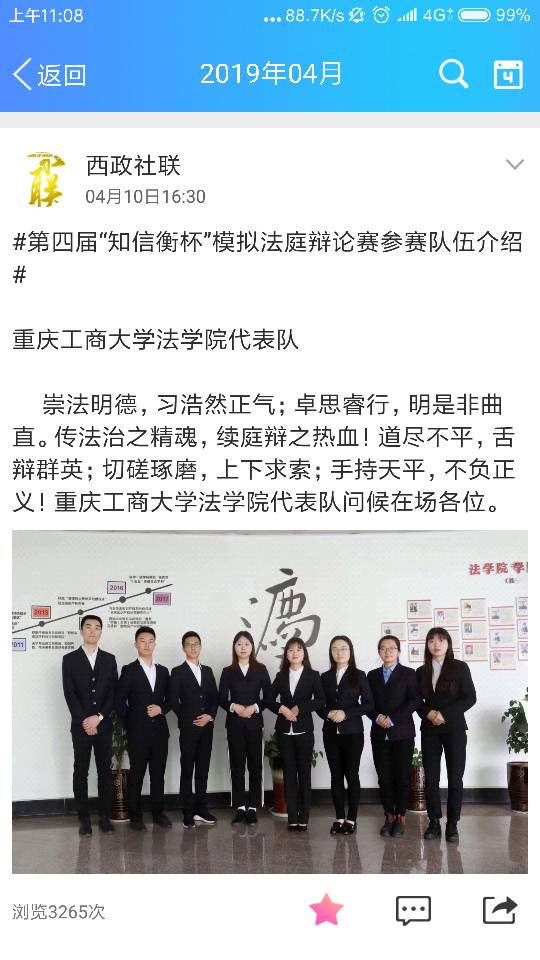 四月初,太阳集团tyc234cc法学院接受西南政法大学的邀请,参加第四届“知信衡杯”模拟法庭辩论赛,这也是太阳集团tyc234cc法学院首次参加西南政法大学举办的“知信衡杯”比赛。