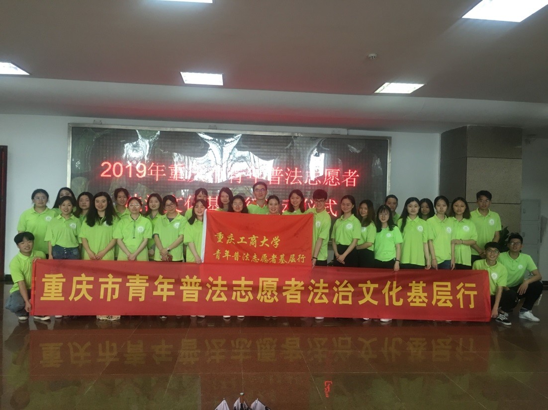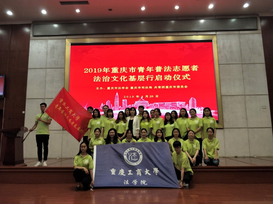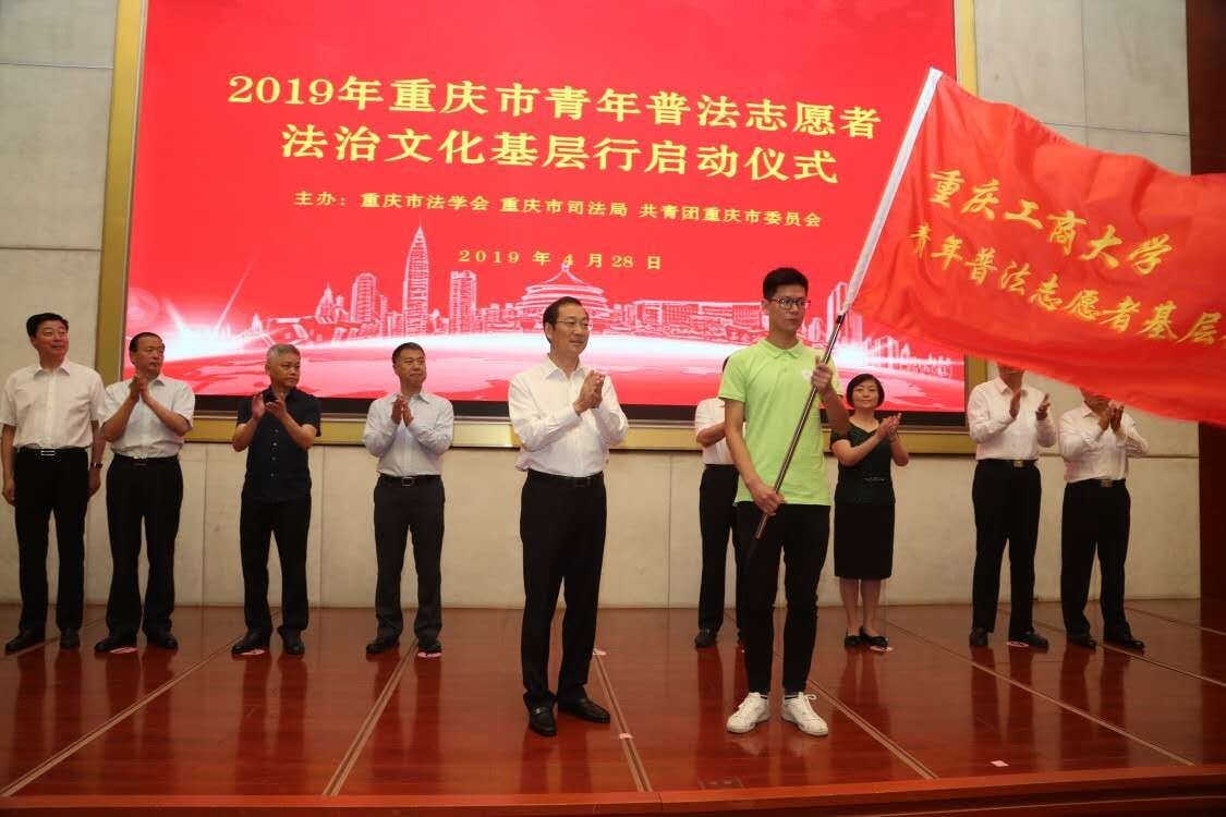 为贯彻习近平总书记全面依法治国新理念新思想新战略,4月28日上午,由重庆市法学会、市司法局、团市委共同主办的2019年青年普法志愿者法治文化基层行活动启动仪式在西南政法大学举行,重庆市委常委、市政法委书记刘强、市司法局局长张德宽、团市委书记张继军等领导出席大会。太阳集团tyc234cc法学院组建的青年普法志愿者服务队参加了本次活动的启动仪式。