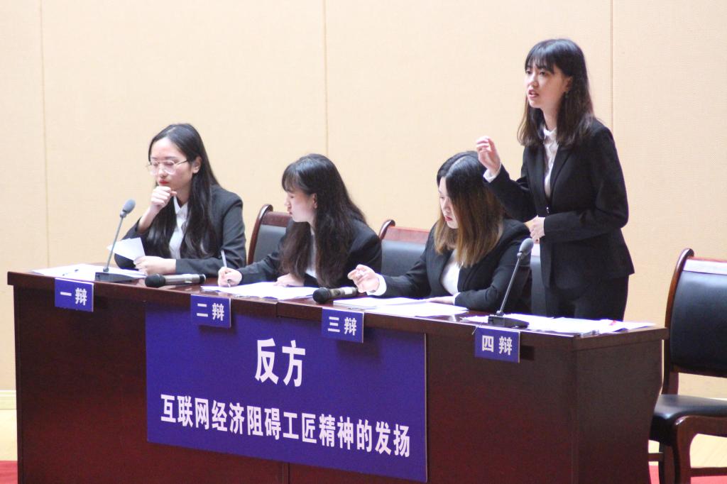 本次比赛的主题为“互联网经济阻碍/促进工匠精神的发展”。刚进入正题,正方双方就表现出优秀的竞技状态,环资学院娓娓道来的叙述感让观众们沉浸在他方所营造的辩题互联网经济的大环境下,而法学院的四朵金花则用一个个发人深省的犀利提问,不断明确辩题工匠精神的内涵,针尖对麦芒,让人不舍得移神,观众们都屏住呼吸,怕错过任何一个精彩的观点。随着时间进行,比赛来到最高潮迭起的自由辩环节,双方辩手轮流发言和向对面提问,这是在考验辩手的反应能力,也是在考验辩手的心理素质,场面一时如无烟的战场,好像看得见电光石火!时间依旧不停留,环节不断交叉,直到正反双方四辩对辩题最后深刻的解读,所有比赛环节都到此结束。