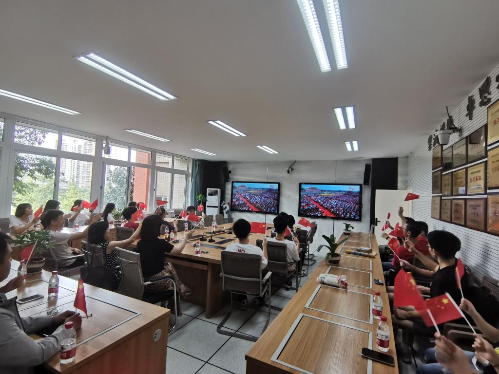 庆祝大会开始,师生们跟随着仪式庄严地唱起国歌,抒发内心对祖国无限的热爱,还情不自禁地挥动手中的国旗,表达对祖国70周年辉煌成就的赞美之情。当大家看到“三军仪仗”、“坦克装甲”、“导弹装备”等一个个雄姿英发、装备优良的部队方阵,惊叹祖国强大的军事力量,为伟大祖国感到自豪。“今天,社会主义中国巍然屹立在世界东方,没有任何力量能够撼动我们伟大祖国的地位,没有任何力量能够阻挡中国人民和中华民族的前进步伐。”习近平总书记在庆祝中华人民共和国成立70周年大会上的讲话铿锵有力,振奋人心,学院师生们认真聆听了总书记讲话中的每一字每一句,每个人内心都激动不已。李国豹老师激动地说道:“这样的庄严宣告令我热血沸腾!作为一名入党积极分子,重任在肩,立志全力拼搏。”曹珈铭同学表示看到祖国强大的武装力量,民族自信心和自豪感油然而生,感激无数烈士先辈的无私奉献,换来今天我们的幸福生活。作为新时代青年应该树立远大理想,为社会主义建设添砖加瓦。周思言同学分享了看到依法治国方队的激动心情,讲述了未来学习规划,立志在专业上学有所成,为祖国的法治进程贡献力量。