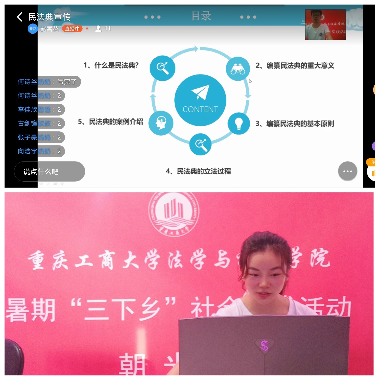 图为大学生志愿者为河屯村小学学生开设《民法典》宣讲线上直播课程。