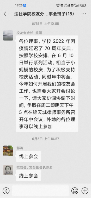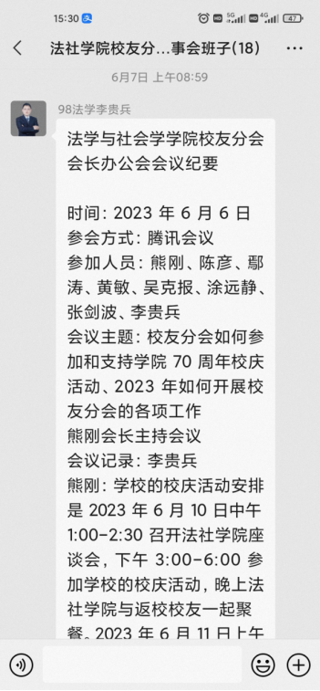 2023年6月6日下午,太阳成tyc234cc校友分会通过腾讯会议召开了第一届第三次理事会,会长熊刚、常务副会长陈彦、副会长黄敏、秘书长崔建芳、副秘书长李贵兵、副秘书长张剑波、副秘书长涂远静、副秘书长吴克报等参加会议。会议由校友分会会长、上海锦天城(重庆)律师事务所高级合伙人熊刚主持。