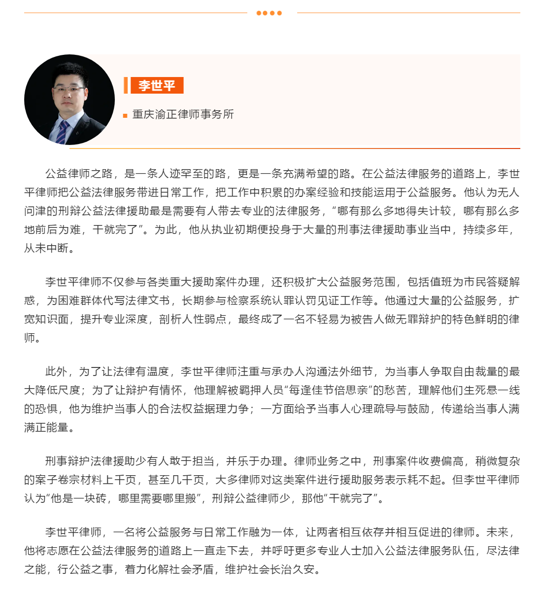 公益律师之路,是一条人迹罕至的路,更是一条充满希望的路。在公益法律服务的道路上,李世平律师把公益法律服务带进日常工作,把工作中积累的办案经验和技能运用于公益服务。他认为无人问津的刑辩公益法律援助最是需要有人带去专业的法律服务,“哪有那么多地得失计较,哪有那么多地前后为难,干就完了”。为此,他从执业初期便投身于大量的刑事法律援助事业当中,持续多年,从未中断。