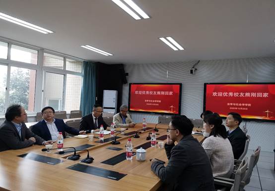 会上,黄文院长对熊刚校友的到访表示欢迎,并全面介绍了学院发展情况。黄院长表示,校友既是学院人才培养的成果,也是极具开发价值的宝贵资源,学院高度重视校友工作,希望依托校友资源建立更多的合作。熊刚律师对学院的多年培养表示感谢,对学院的办学效果表示高度认可与赞赏,并期待与学院开展更深层次的合作。