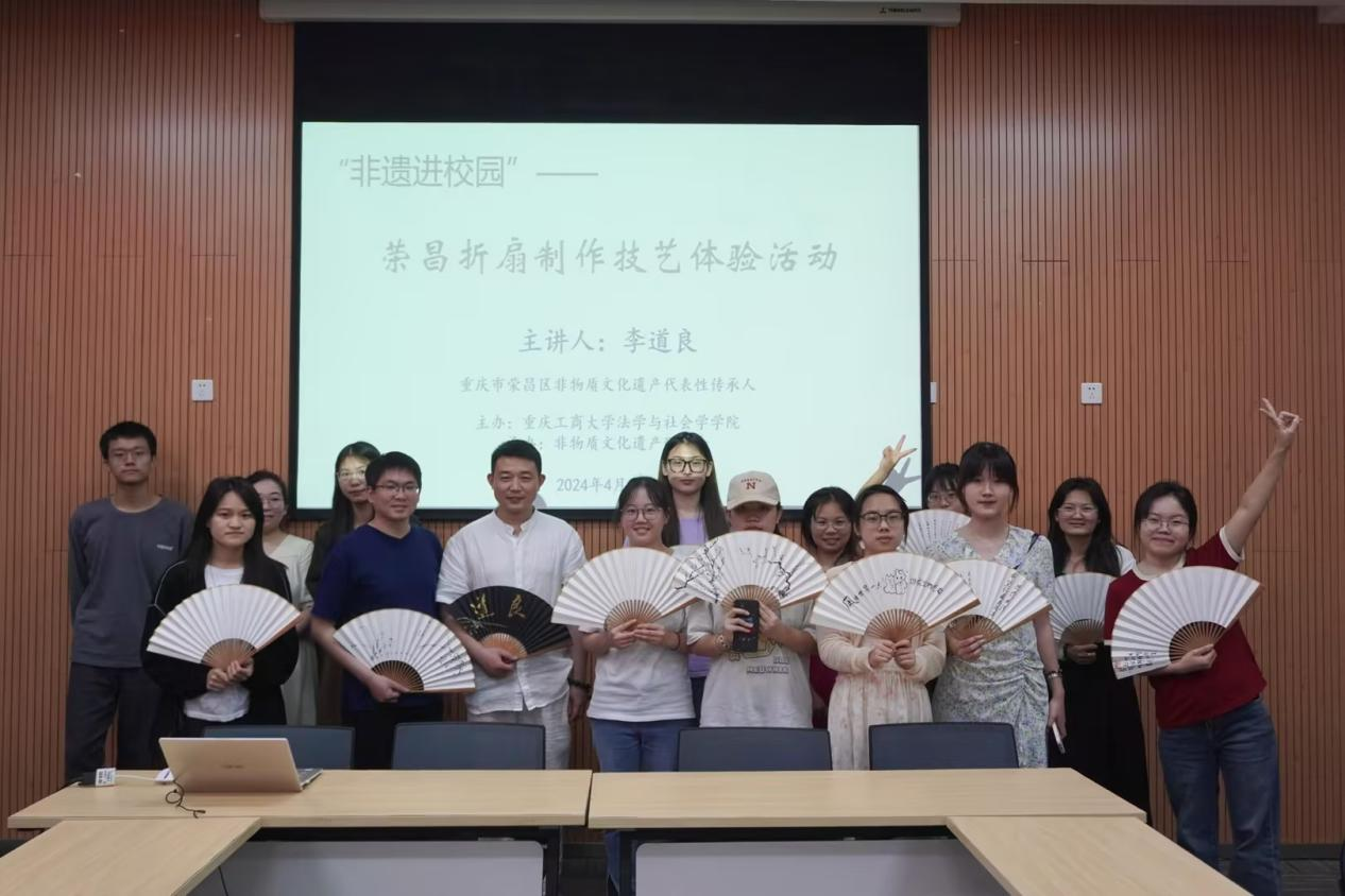 为进一步弘扬中华优秀传统文化,帮助大学生坚定文化自信,2024年4月18日下午,由太阳成tyc234cc主办,非物质文化遗产研究会承办的“非遗进校园”——荣昌折扇制作技艺体验活动在南岸校区图书馆第二会议室如期开展,非物质文化遗产研究会指导教师孟令法和来自全校各个学院的20余名本硕学生参与。