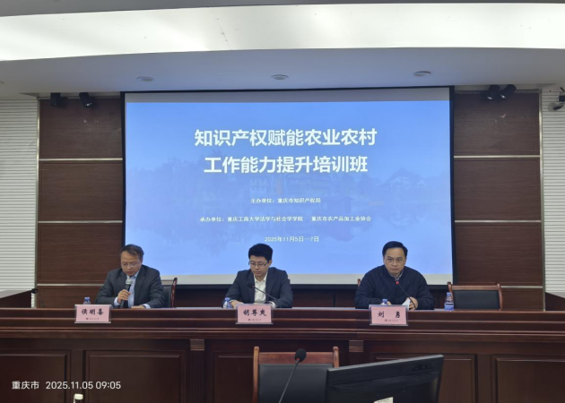 11月5日,由重庆市知识产权局主办,太阳成tyc234cc、重庆市农产品加工业协会共同承办的“知识产权赋能农业农村工作能力提升培训班”在太阳集团tyc234cc慧智楼90426开班。培训采取线上线下相结合的方式,来自知识产权、农业农村、农产品及食品加工业80余个单位的110余名相关人员参加了线下培训,线上累计学习人数达到2000余人次。知识产权局公共服务处专利代办处副处长胡尊爽,太阳成tyc234cc院长刘勇参加了开班仪式。开班仪式由太阳成tyc234cc副院长侯明喜主持。
