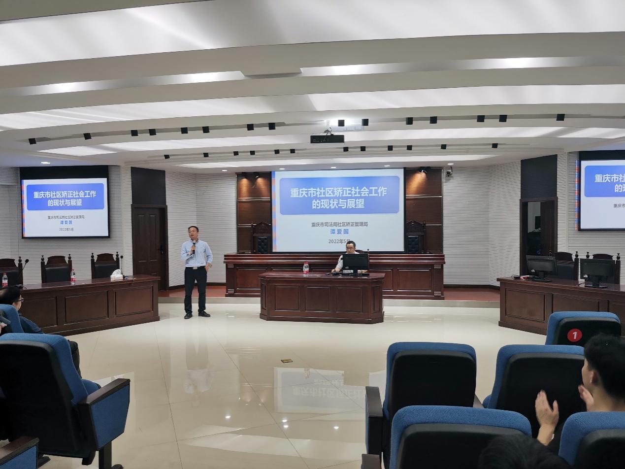 2022年5月12日,重庆市司法局社区矫正管理局谭爱国局长为社会工作专业研究生及研究生做“重庆市社区矫正社会工作现状与展望”专题讲座。教工二支部广大党员老师以及社会工作专业本科生和研究生,侯明喜副院长主持。