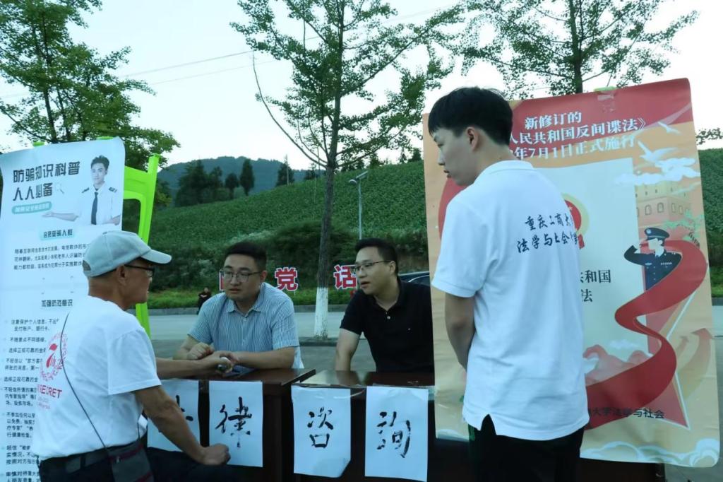 在太平乡政府工作人员的带领下,服务队一行还走访了太平坝乡司法所所长何家伟,了解当地反诈防骗宣传工作开展情况及典型案例。何家伟带领服务队师生在太平乡凤凰社区广场依托“百姓大舞台”开展防范诈骗普法宣讲和小品演出,并设立法律义务咨询点,由法学系主任公杰博士与向往博士为群众提供法律义务咨询。